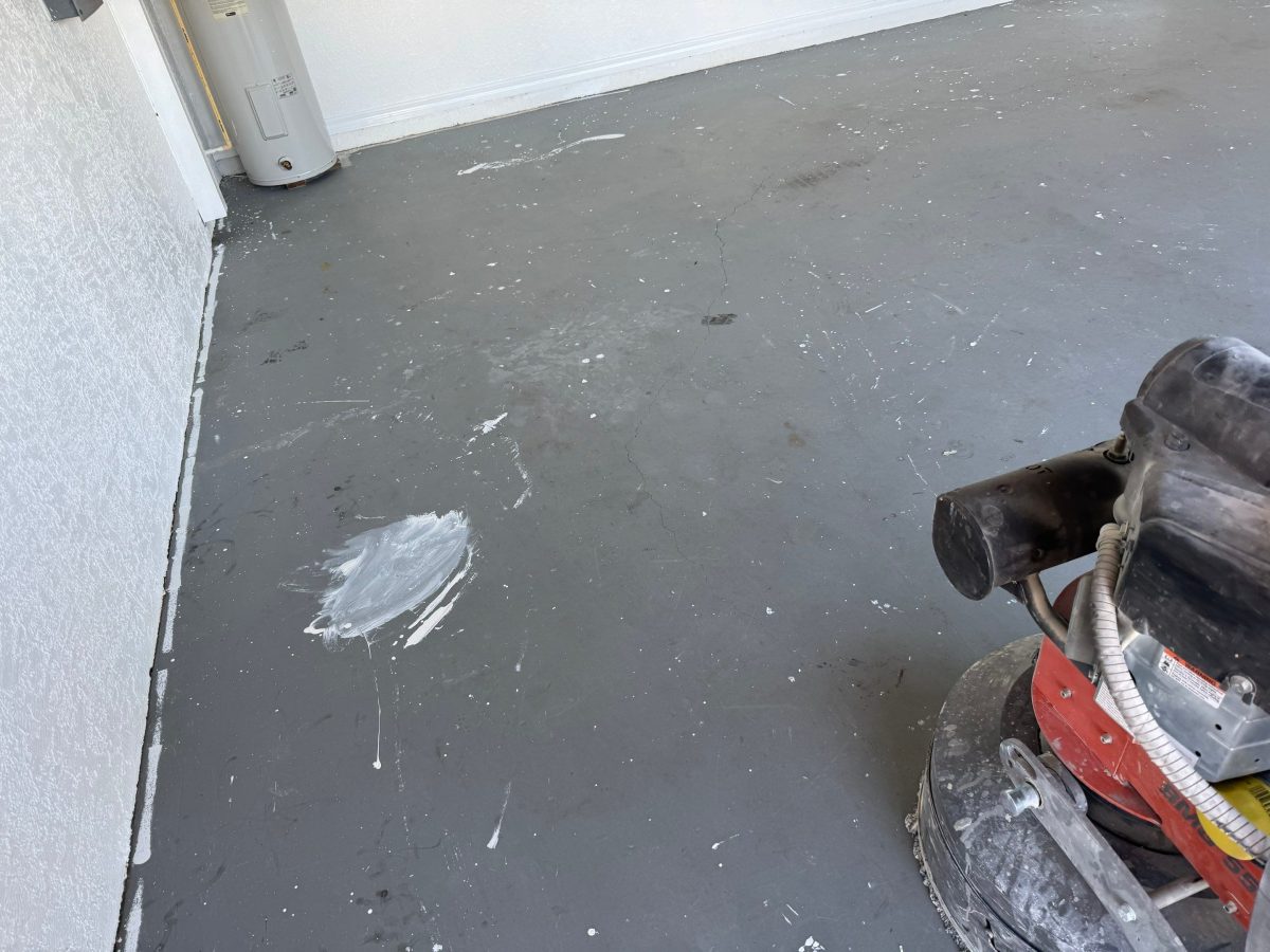 We began by grinding the floor to remove stains, paint splatters, and uneven areas. This step ensured the epoxy coating would bond securely and evenly.